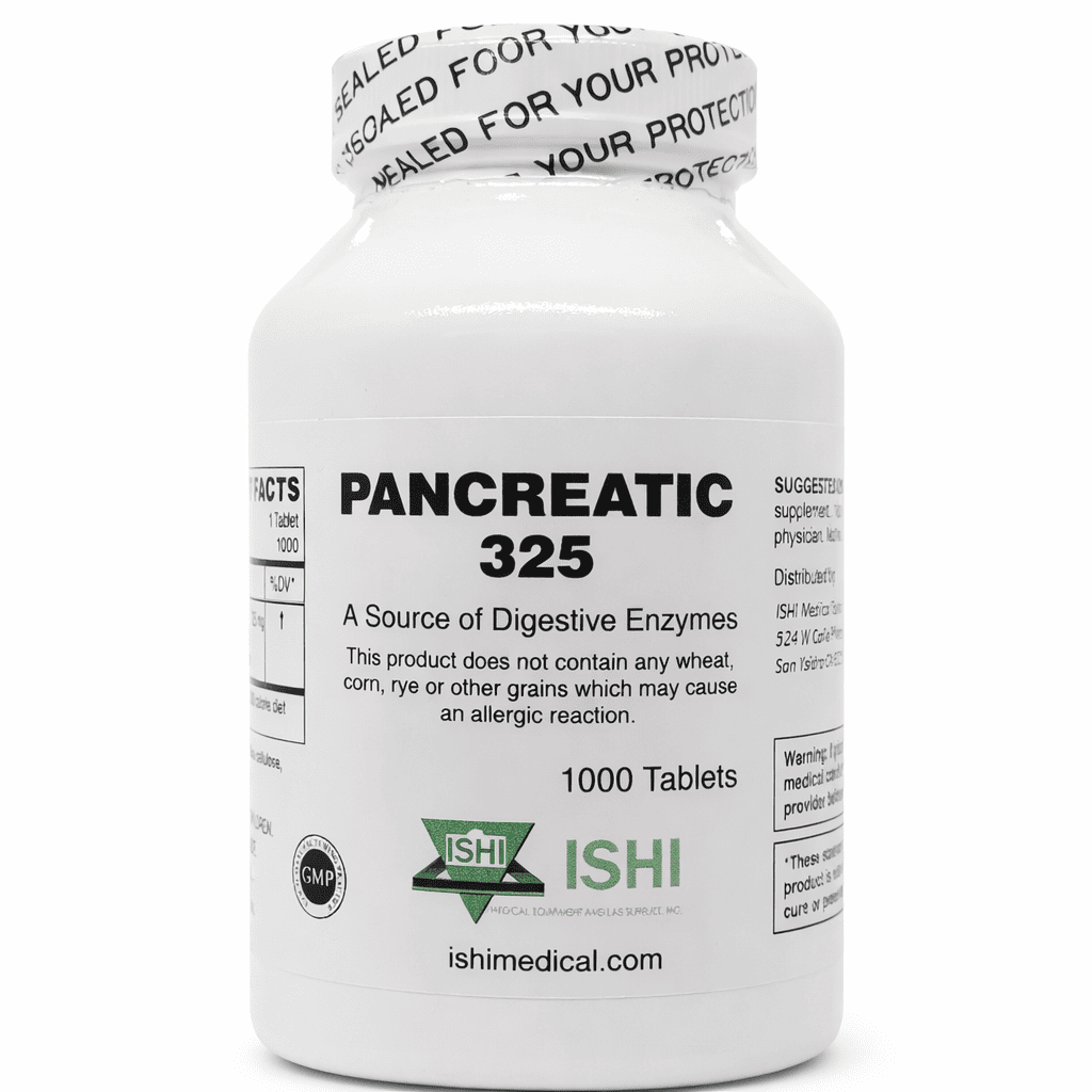 Suplemento de enzimas digestivas (Pancreatina 325 mg). Apoya la digestión y la correcta absorción de nutrientes. Presentación de 1000 tabletas.